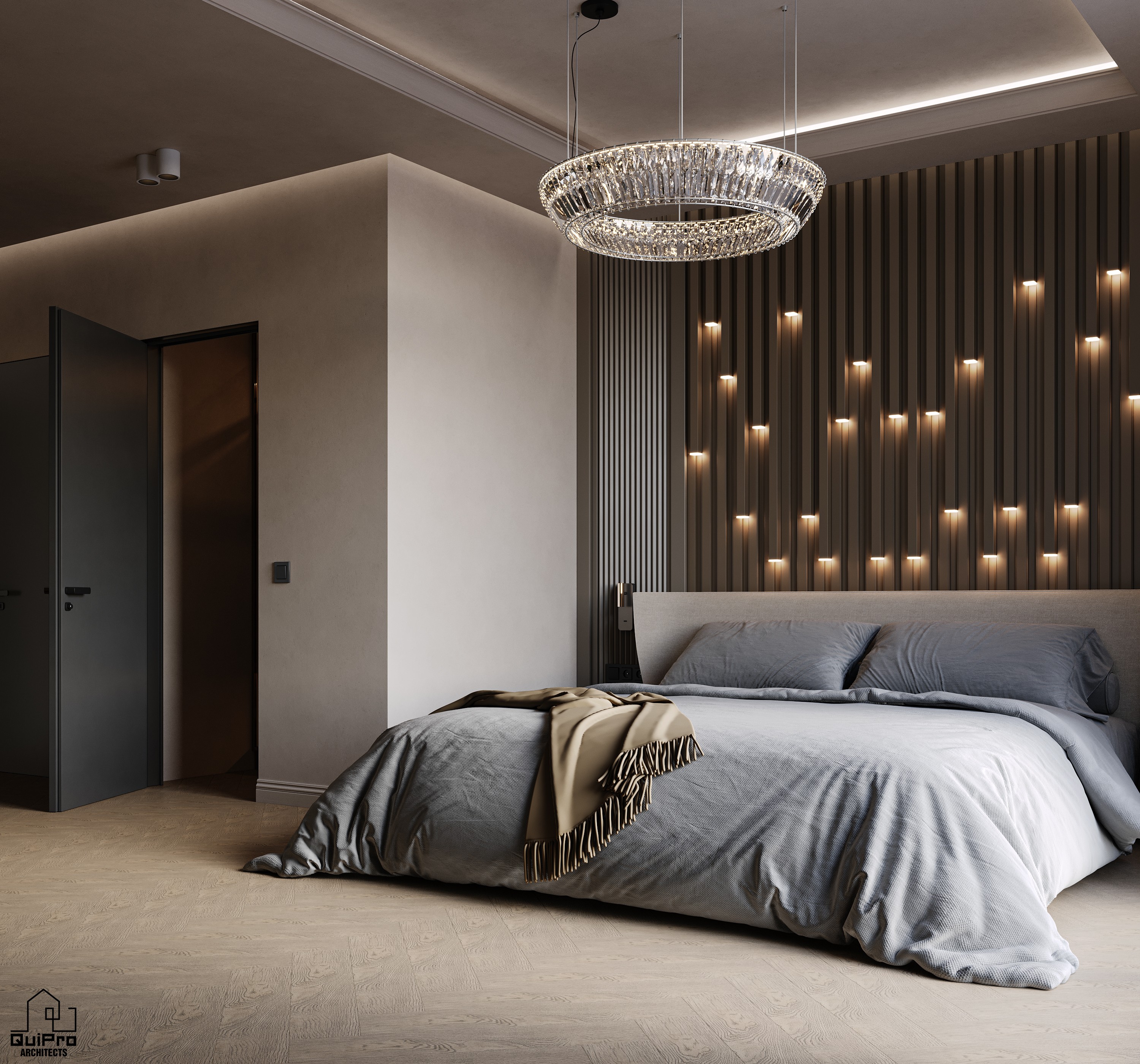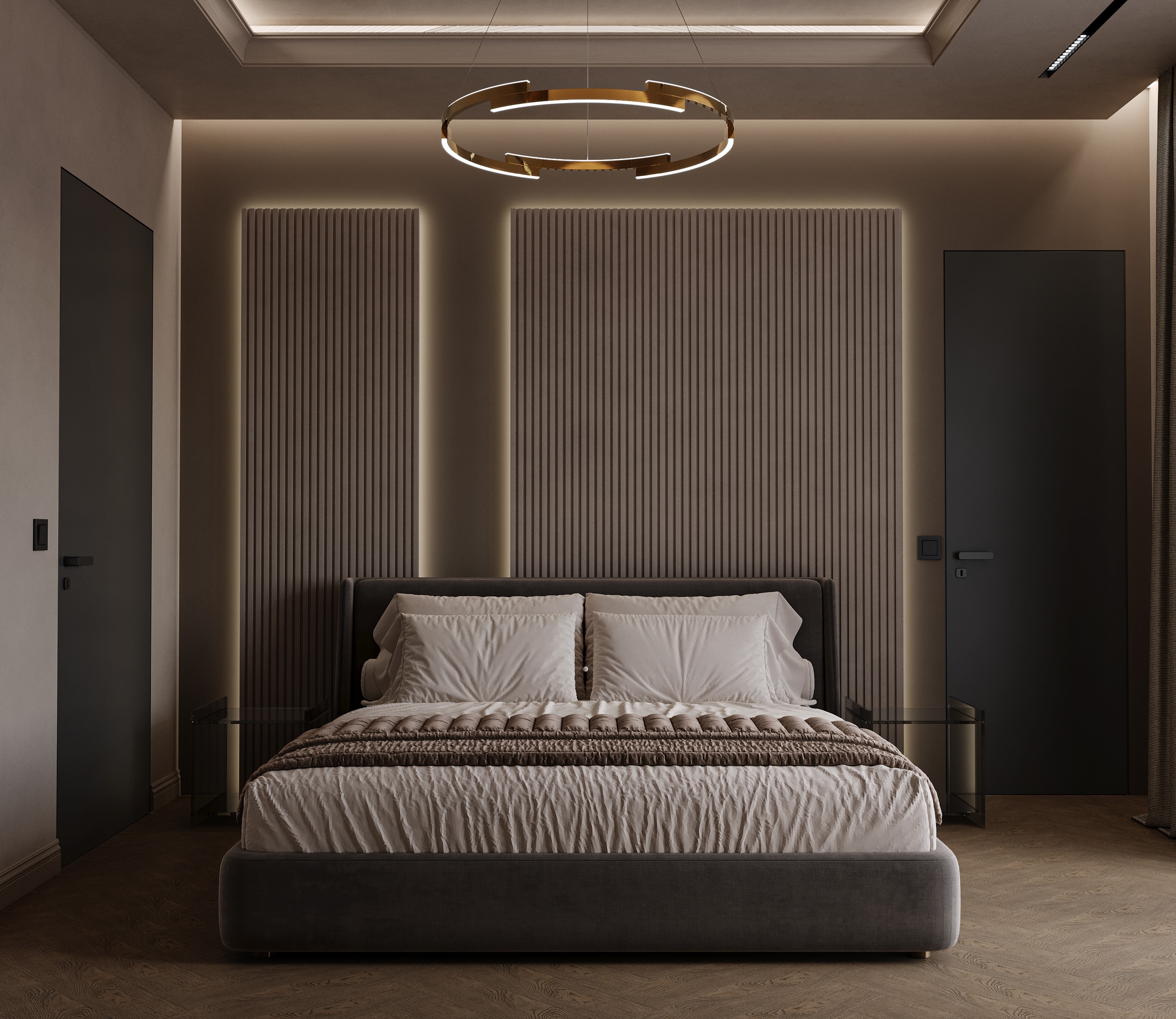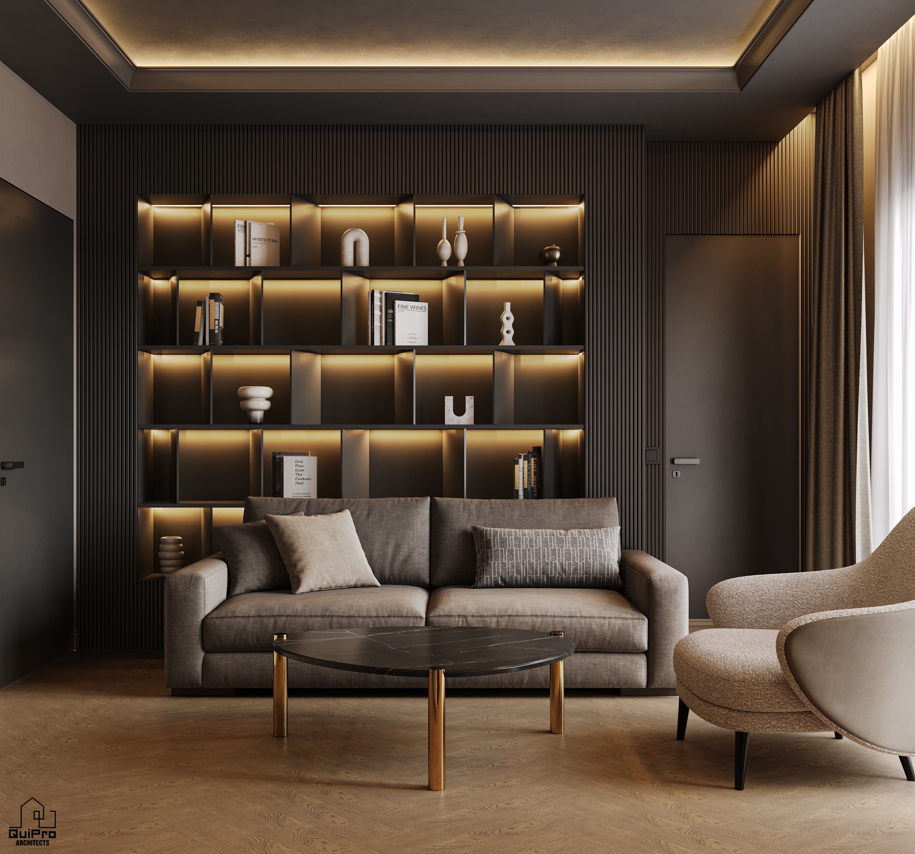 Interiorul continuă această direcție prin panouri riflate, iluminat indirect integrat și o paletă cromatică neutră, dominată de griuri calde și tonuri de lemn închis. Biblioteca iluminată devine un element scenografic central, iar dormitoarele mizează pe simetrie și echilibru.