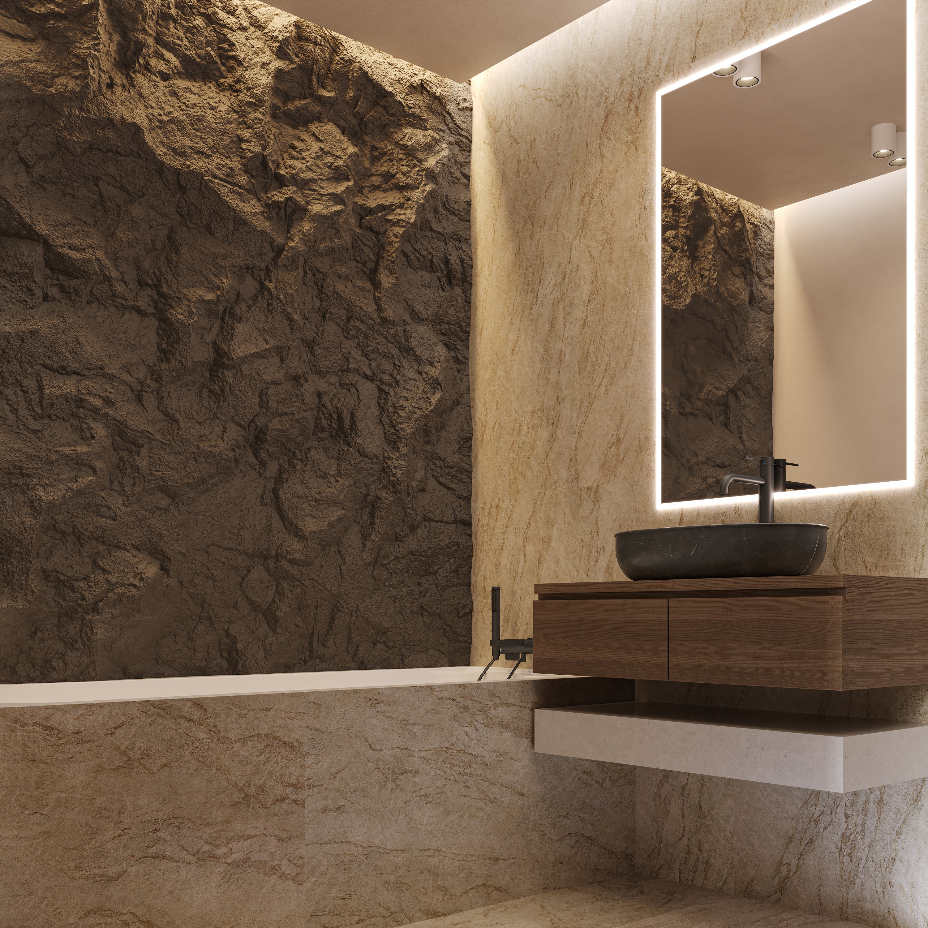 Baia introduce o estetică aproape sculpturală, cu placări minerale texturate și iluminare perimetrală care pune în valoare materialitatea brută a suprafețelor.