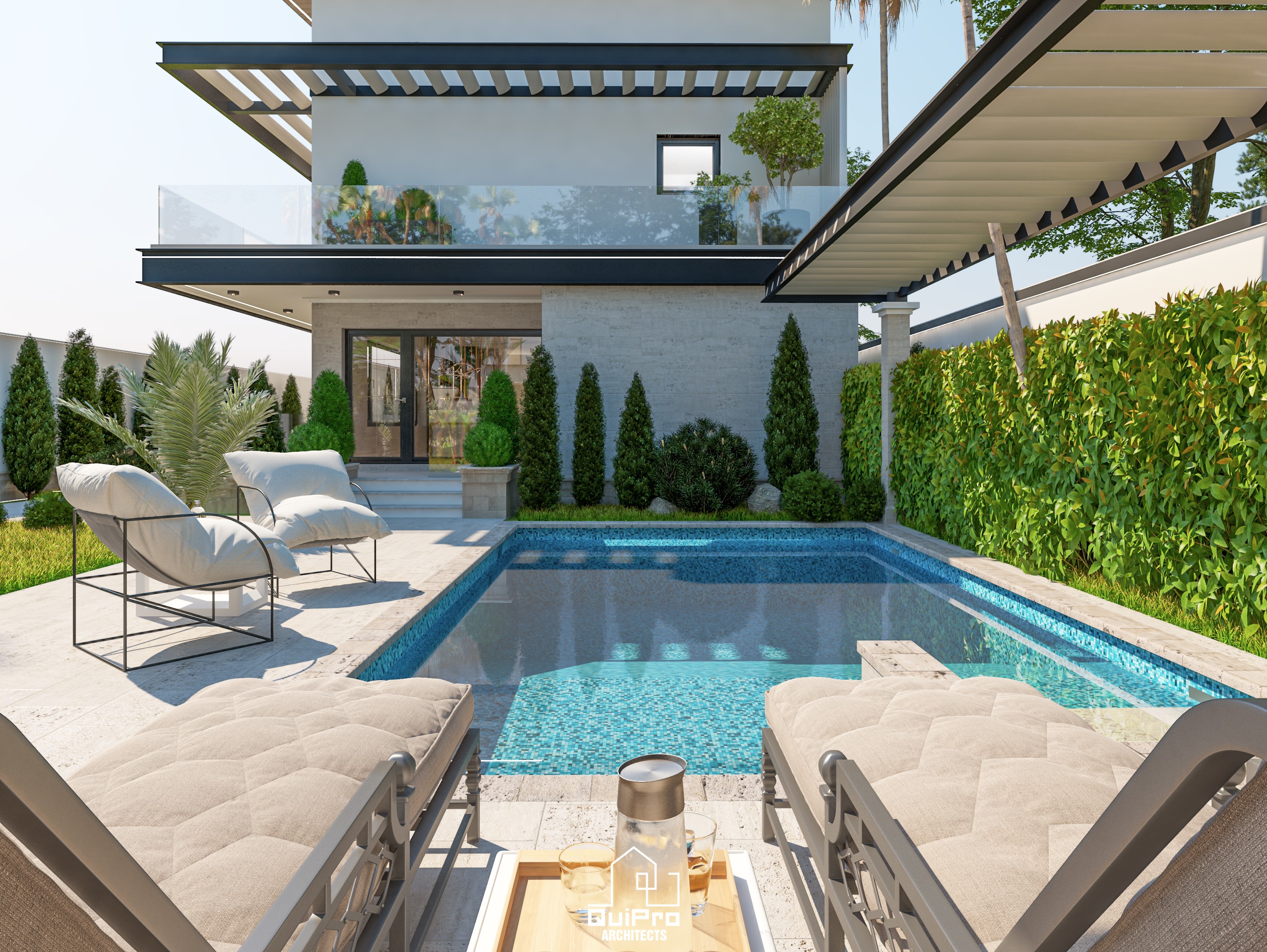 Exteriorul continuă limbajul contemporan prin volume clare și suprafețe curate, cu parapete din sticlă și finisaje minerale. Zona terasei și piscina sunt concepute ca o extensie naturală a spațiului interior, susținând un stil de viață orientat spre relaxare și socializare.