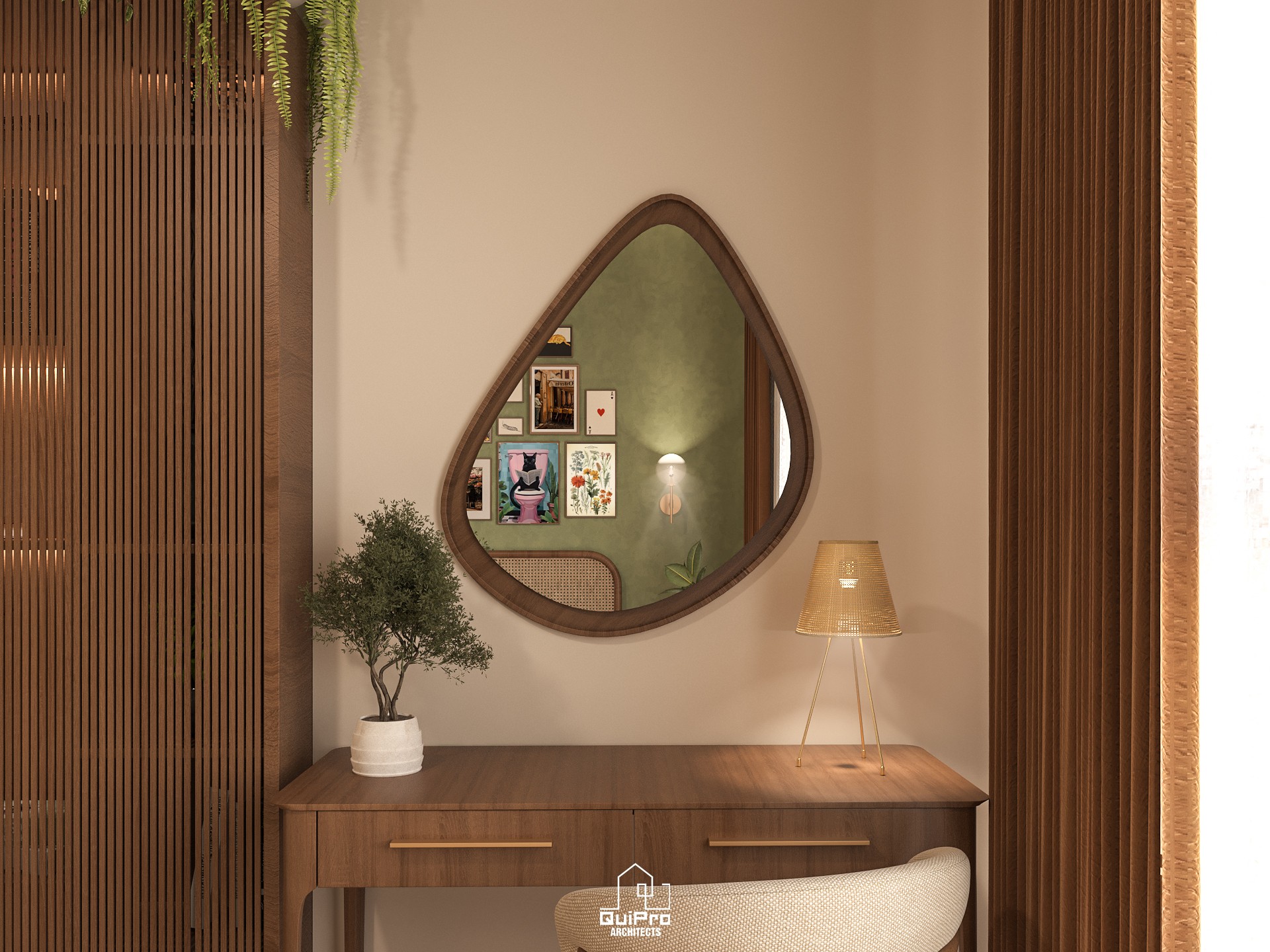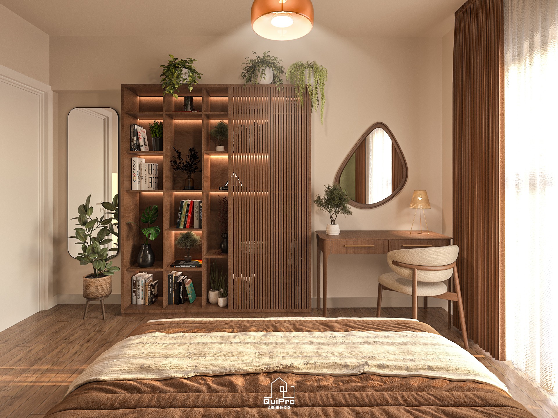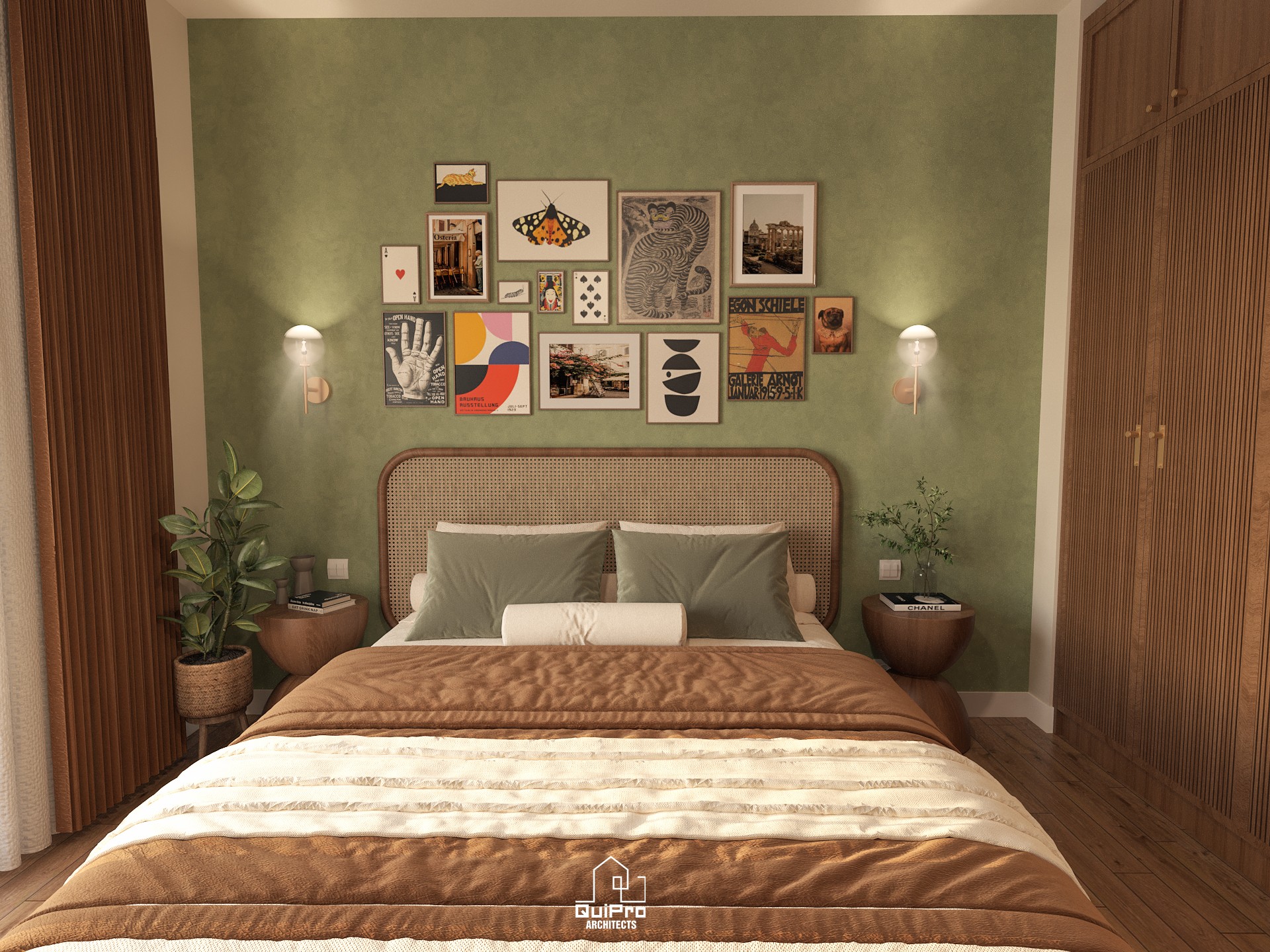 Dormitorul introduce un perete accent verde, decorat cu o compoziție artistică de tablouri, transformând spațiul într-un refugiu intim, dar expresiv. Mobilierul cu influențe mid-century și detaliile din ratan completează atmosfera caldă și echilibrată.