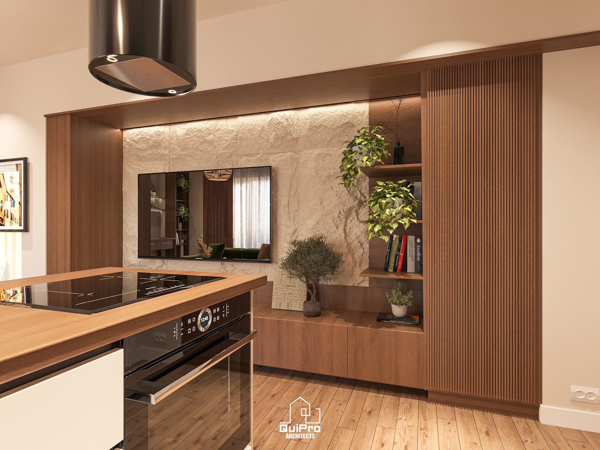 Zona de living și bucătărie este definită de placări riflate, iluminat ambiental integrat și o insulă cu detaliu vertical accentuat. Faianța verde adaugă un contrast vibrant și aduce o notă fresh într-un decor dominat de tonuri calde.