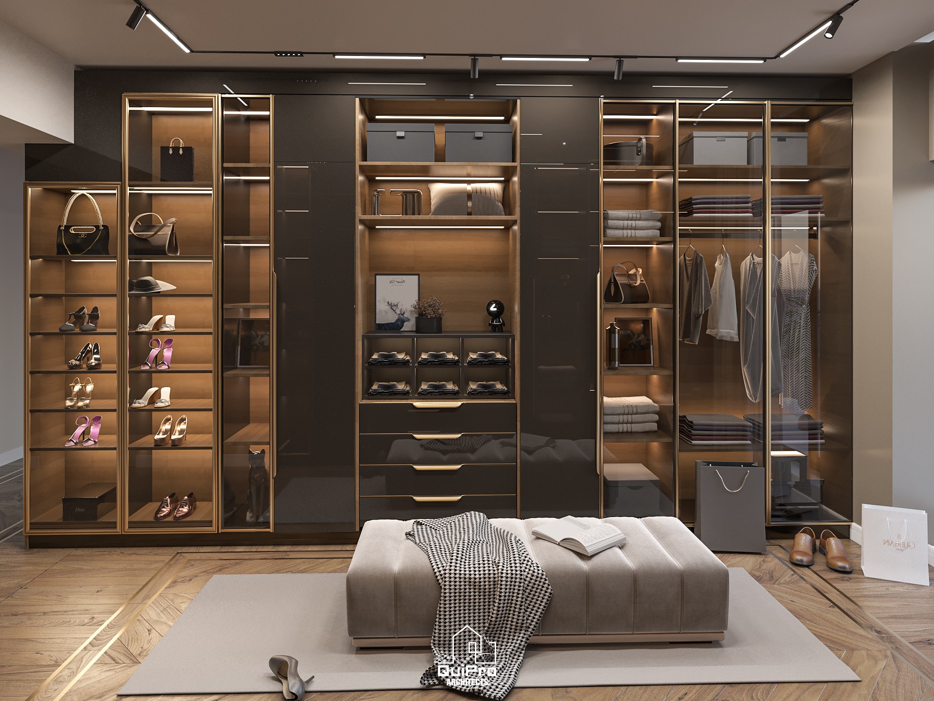 Bucătăria este minimalistă și rafinată, cu fronturi curate și iluminare ambientală integrată, iar insula bar devine element social central. Dressingul cu vitrine fumurii și iluminare interioară introduce o notă high-end, aproape boutique.