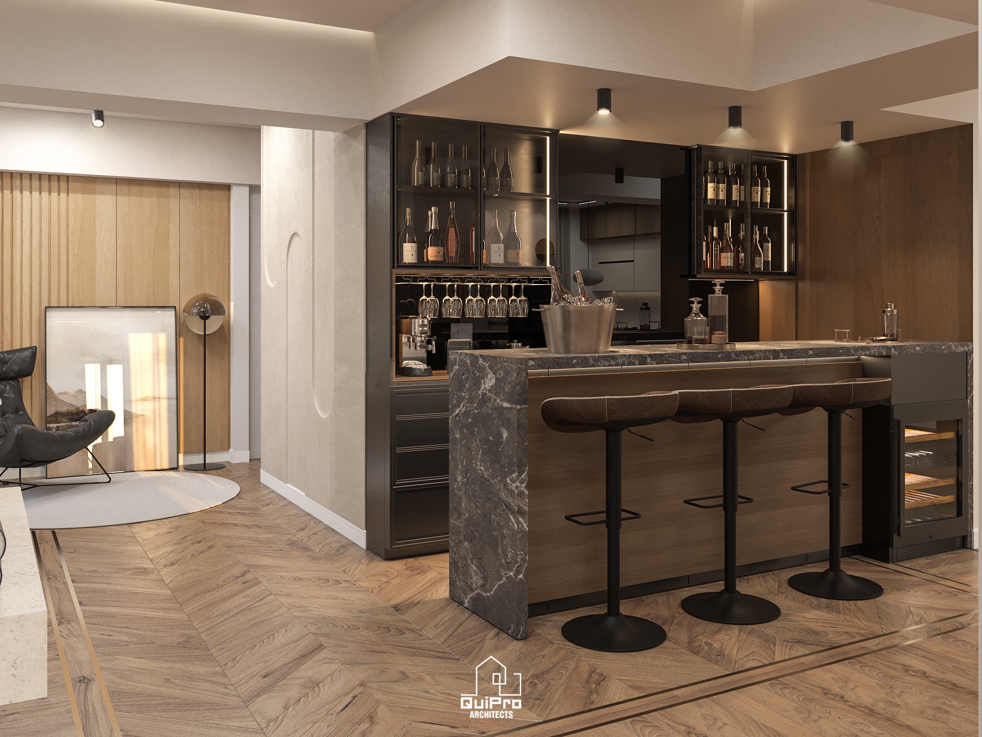 Texturile sunt stratificate: lemn natural, sticlă fumurie, piatră cu inserții fine și textile moi. Integrarea elementelor personalizate – zona de bar, sistemele de depozitare, mobilierul fix – consolidează caracterul exclusiv al proiectului.