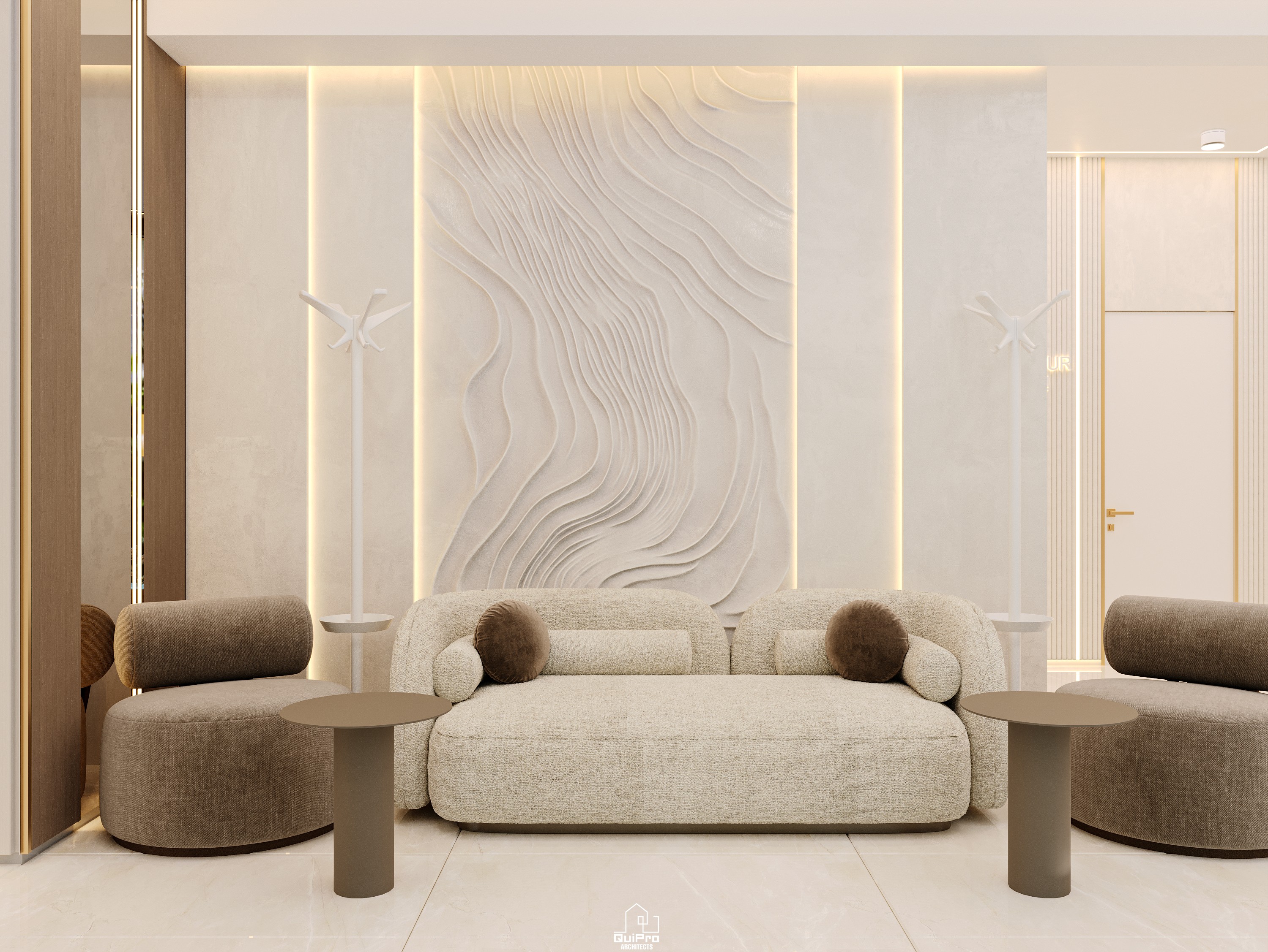 Zona de recepție este concepută ca un spațiu deschis, cu vitraje ample și conexiune vizuală către exterior. Mobilierul cu forme rotunjite și textura caldă a finisajelor reduc percepția rigidă asociată spațiilor medicale.