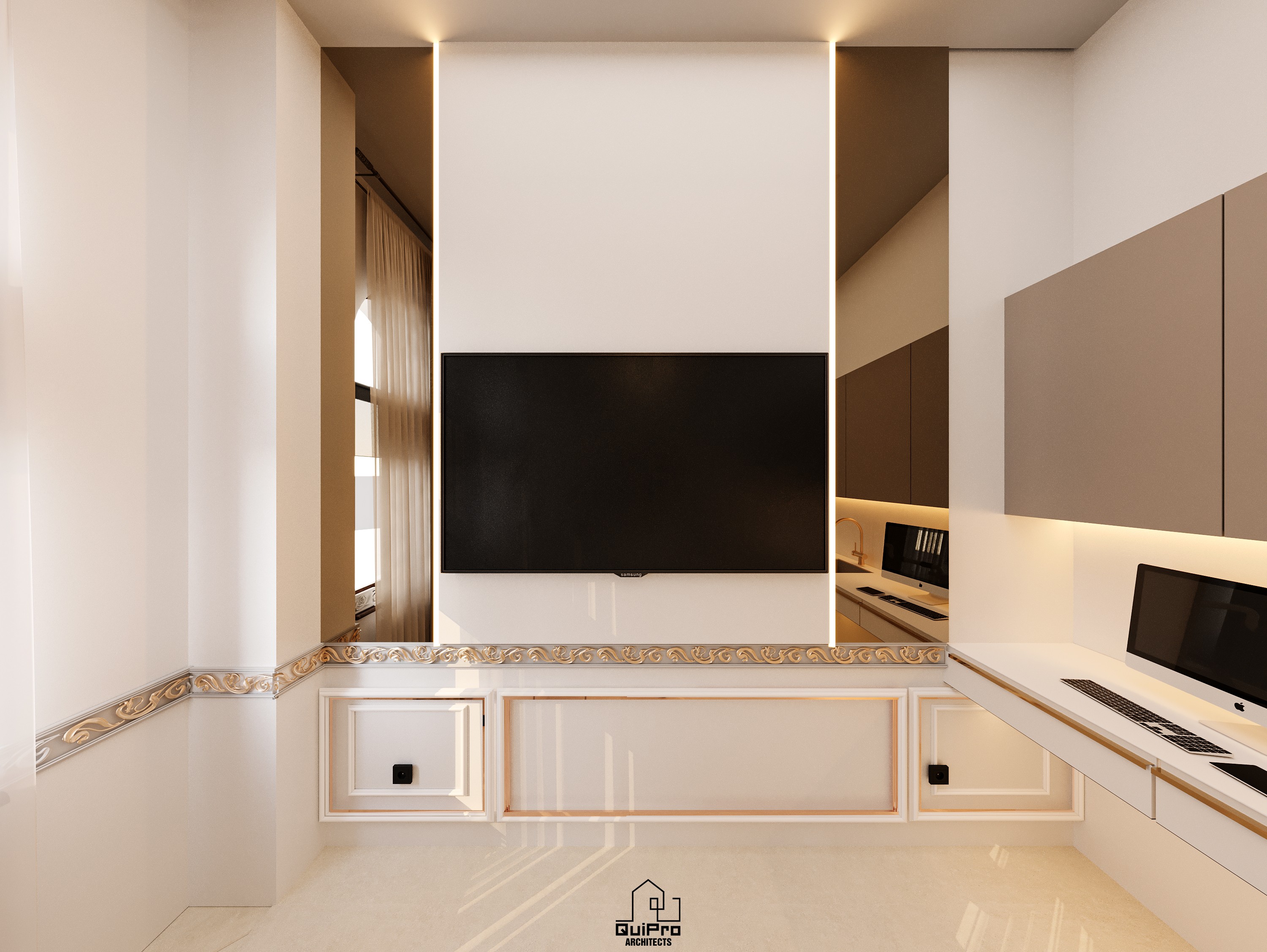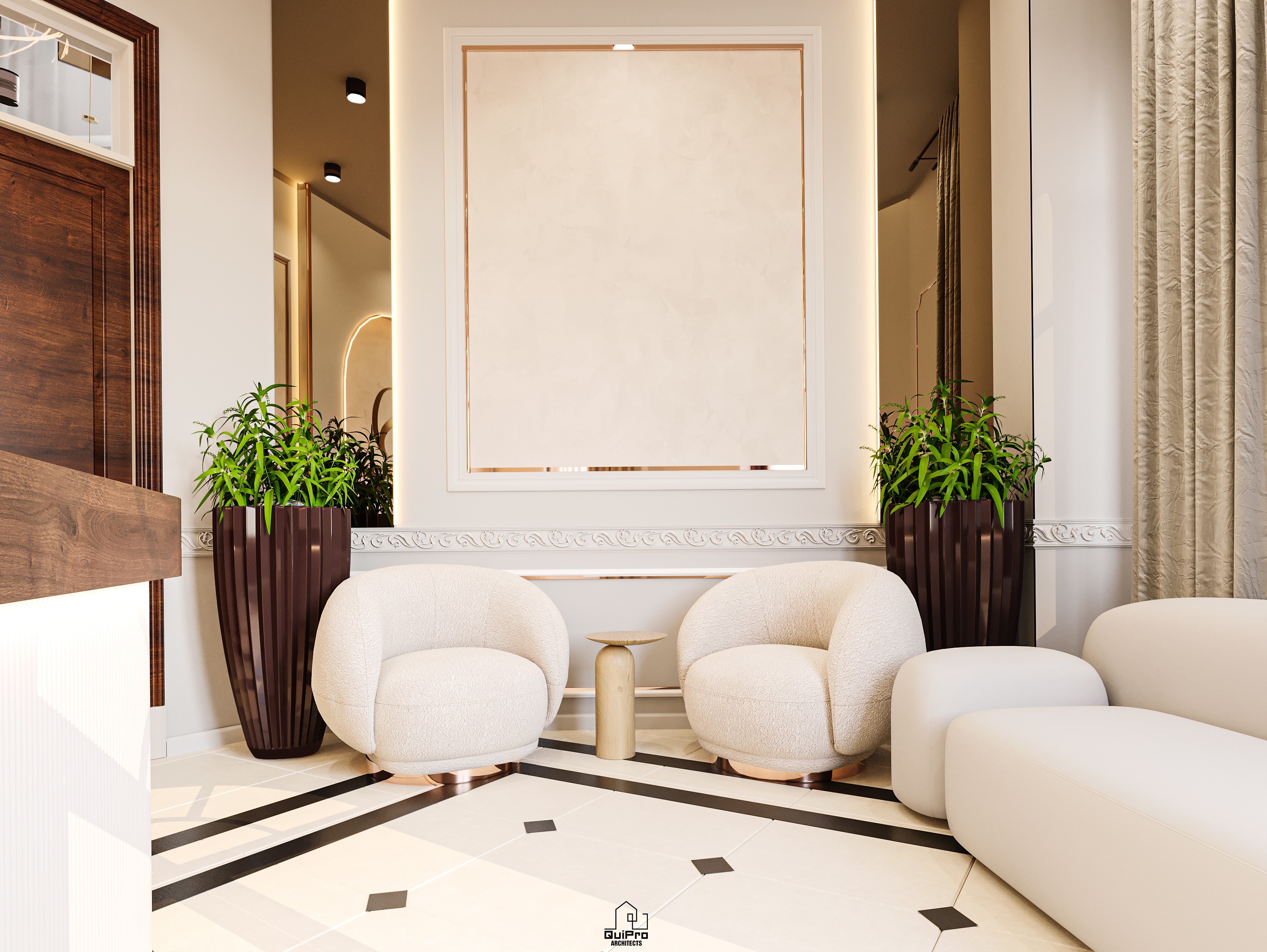 Zona de recepție funcționează ca un statement vizual: branding iluminat, texturi calde, accente aurii și o compoziție simetrică ce sugerează stabilitate și autoritate. Limbajul modern-classic este prezent prin profile decorative reinterpretate într-o manieră minimalistă.